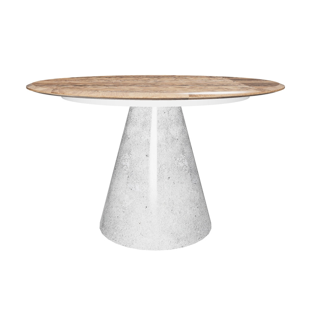 Jedilna miza Drop je kiparska izjava, ki združuje naravno toplino z arhitekturno trdnostjo. Z okroglo ploščo iz masivnega lesa, postavljeno na višino jedilnice 75 cm, jo podpira drzno, stožčasto betonsko podnožje, ki mizi daje tako stabilnost kot prepoznaven značaj. Ročno izdelana z natančnostjo in pozornostjo do detajlov, ta dizajn uravnoteži eleganco in trdnost, zaradi česar je brezčasen osrednji element za sodobne domove, restavracije ali butične jedilnice.